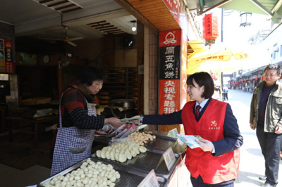 (圖為姜堰稅務(wù)志愿者在溱潼老街向沿街商鋪發(fā)放稅費政策宣傳冊)