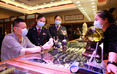 (圖為東??h稅務(wù)干部在“水晶小鎮(zhèn)”向商戶宣傳稅費政策)