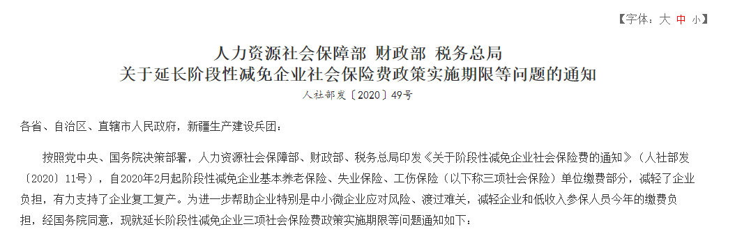 人力資源社會(huì)保障部 財(cái)政部 稅務(wù)總局關(guān)于延長階段性減免企業(yè)社會(huì)保險(xiǎn)費(fèi)政策實(shí)施期限等問題的通知人社部發(fā)〔2020〕49號(hào)各省、自治區(qū)、直轄市人民政府,新疆生產(chǎn)建設(shè)兵團(tuán):